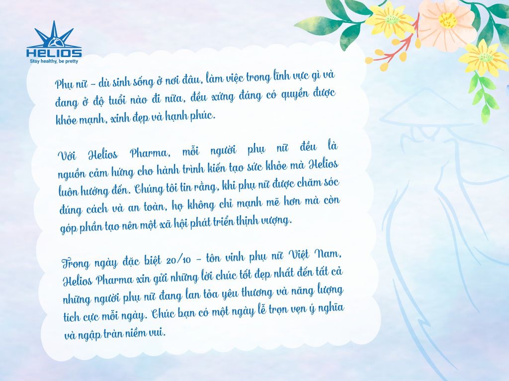 CHÚC MỪNG NGÀY PHỤ NỮ VIỆT NAM (20/10/2025) 20/10/25 Nhi Nguyễn Các bài viết liên quan HƯỞNG ỨNG NGÀY ĐỘT QUỴ THẾ GIỚI (29/10/2025) THÁNG 10 NƠ HỒNG - CÙNG CHUNG TAY HÀNH ĐỘNG PHÒNG, CHỐNG UNG THƯ VÚ HELIOS PHARMA MANG NIỀM VUI TRUNG THU ĐẾN BỆNH NHÂN NHI ĐANG ĐIỀU TRỊ TẠI BỆNH VIỆN TRUYỀN MÁU HUYẾT HỌC TP. HCM CHÚC MỪNG NGÀY DƯỢC SĨ THẾ GIỚI (25/9/2025) HELIOS PHARMA HÂN HẠNH LÀ ĐỒNG TÀI TRỢ CỦA HỘI NGHỊ TRUYỀN MÁU HUYẾT HỌC VIỆT NAM LẦN 8 VÀ HỘI NGHỊ TRUYỀN MÁU - GHÉP - LIỆU PHÁP TẾ BÀO VIỆT - PHÁP MỞ RỘNG LẦN 8